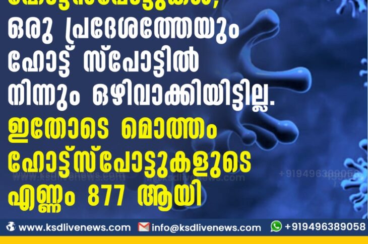 കേരളം സംസ്ഥാനത്ത് ഇന്ന് 07 പുതിയഹോട്ട്സ്പോട്ടുകള്കൂടി;ഒരു പ്രദേശത്തേയും ഹോട്ട് സ്പോട്ടിൽ നിന്നും ഒഴിവാക്കിയിട്ടില്ല…… ഇതോടെ മൊത്തം ഹോട്ട്സ്പോട്ടുകളുടെ എണ്ണം 877 ആയി.May 22, 2021