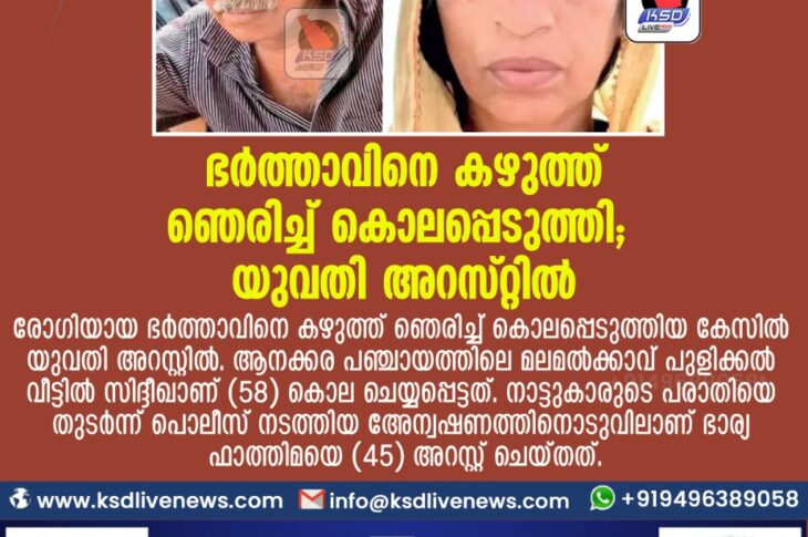 ഭര്ത്താവിനെ കഴുത്ത് ഞെരിച്ച് കൊലപ്പെടുത്തി; യുവതി അറസ്റ്റിൽ