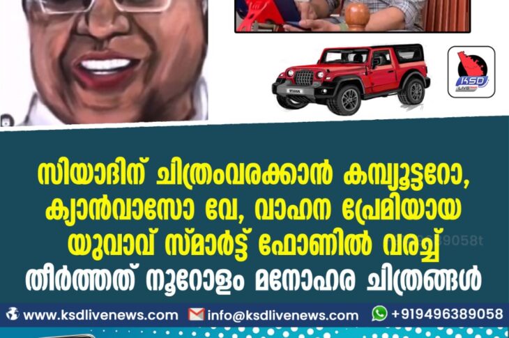 കാസർഗോഡ് സിയാദിന് ചിത്രംവരക്കാന് കമ്പ്യൂട്ടറോ, ക്യാന്വാസോ വേണ്ട, വാഹന പ്രേമിയായ യുവാവ് സ്മാര്ട്ട് ഫോണില് വരച്ച് തീര്ത്തത് നൂറോളം മനോഹര ചിത്രങ്ങള്May 19, 2021