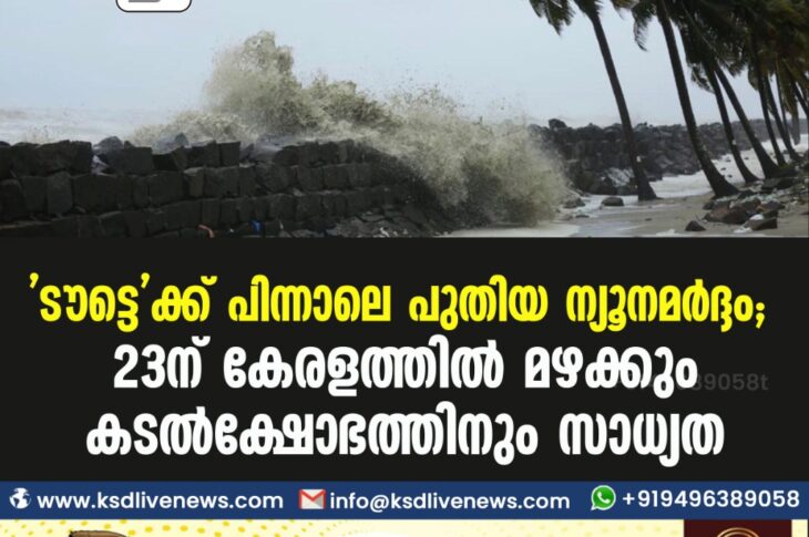 കേരളം ‘ടൗട്ടെ’ക്ക് പിന്നാലെ പുതിയ ന്യൂനമര്ദ്ദം 23ന്; കേരളത്തില് മഴക്കും കടല്ക്ഷോഭത്തിനും സാധ്യതMay 19, 2021