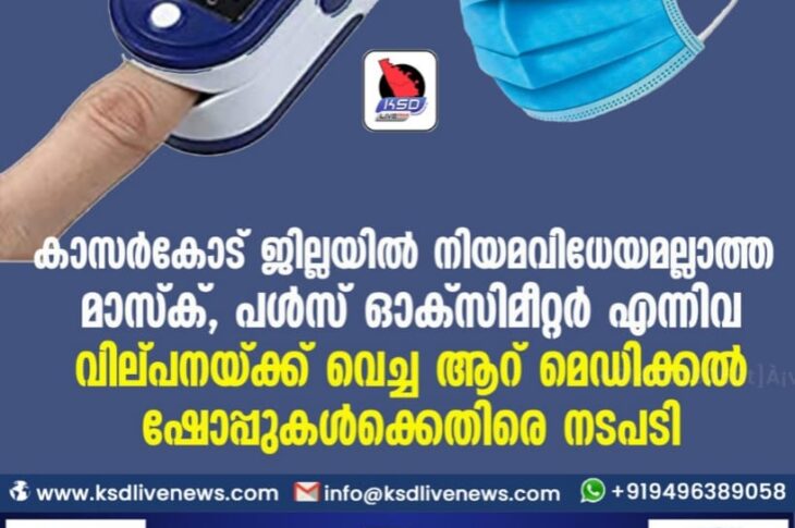 കാസർഗോഡ് കാസർകോട് ജില്ലയിൽ നിയമവിധേയമല്ലാത്ത മാസ്ക്, പൾസ് ഓക്സിമീറ്റർ എന്നിവ വില്പനയ്ക്ക് വെച്ചആറ് മെഡിക്കൽ ഷോപ്പുകൾക്കെതിരെ നടപടിMay 17, 2021