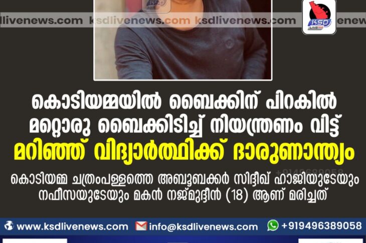 പ്രാദേശികം കൊടിയമ്മയിൽ ബൈക്കിന് പിറകില് മറ്റൊരു ബൈക്കിടിച്ച് നിയന്ത്രണം വിട്ട് മറിഞ്ഞ് വിദ്യാര്ത്ഥിക്ക് ദാരുണാന്ത്യംMay 10, 2021
