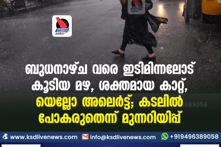 കേരളം ബുധനാഴ്ച വരെ ഇടിമിന്നലോട് കൂടിയ മഴ, ശക്തമായ കാറ്റ്, യെല്ലോ അലര്ട്ട്; കടലില് പോകരുതെന്ന് മുന്നറിയിപ്പ്May 9, 2021