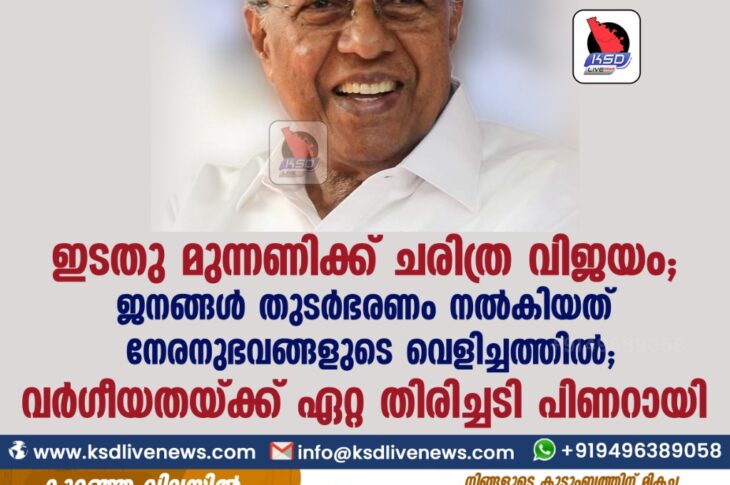 കേരളം ഇടതു മുന്നണിക്ക് ചരിത്ര വിജയം; ജനങ്ങള് തുടര്ഭരണം നല്കിയത് നേരനുഭവങ്ങളുടെ വെളിച്ചത്തില്; വർഗീയതയ്ക്ക് ഏറ്റ തിരിച്ചടി- പിണറായിMay 2, 2021