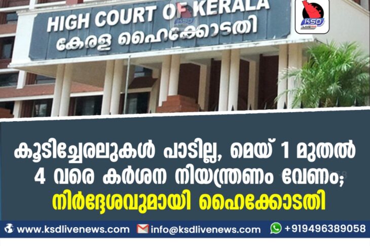 കേരളം കൂടിച്ചേരലുകള് പാടില്ല, മെയ് 1 മുതല് 4 വരെ കര്ശന നിയന്ത്രണം വേണം; നിര്ദ്ദേശവുമായി ഹൈക്കോടതിApril 30, 2021