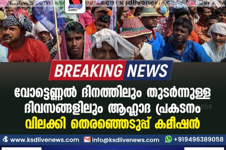 ദേശീയം വോട്ടെണ്ണൽ ദിനത്തിലും തുടർന്നുള്ള ദിവസങ്ങളിലും ആഹ്ലാദ പ്രകടനം വിലക്കി തെരഞ്ഞെടുപ്പ് കമീഷൻApril 27, 2021