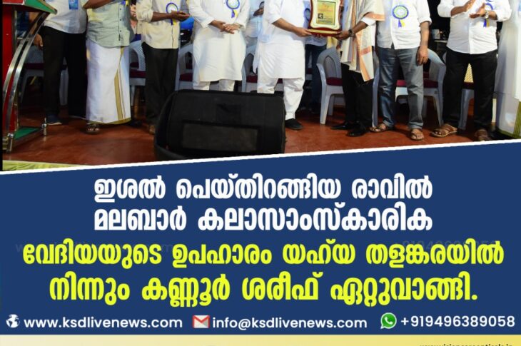 കാസർഗോഡ് ഇശൽ പെയ്തിറങ്ങിയ രാവിൽ മലബാർ കലാസാംസ്കാരിക വേദിയയുടെ ഉപഹാരം യഹ്യ തളങ്കരയിൽ നിന്നും കണ്ണൂർ ശരീഫ് ഏറ്റുവാങ്ങിMarch 2, 2021