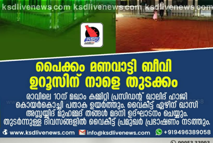 പൈക്കം മണവാട്ടി ബീവി ഉറൂസിന് നാളെ തുടക്കം