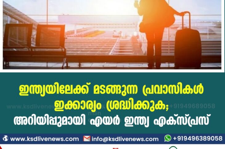 ദേശീയം ഇന്ത്യയിലേക്ക് മടങ്ങുന്ന പ്രവാസികള് ഇക്കാര്യം ശ്രദ്ധിക്കുക; അറിയിപ്പുമായി എയര് ഇന്ത്യ എക്സ്പ്രസ്.February 25, 2021