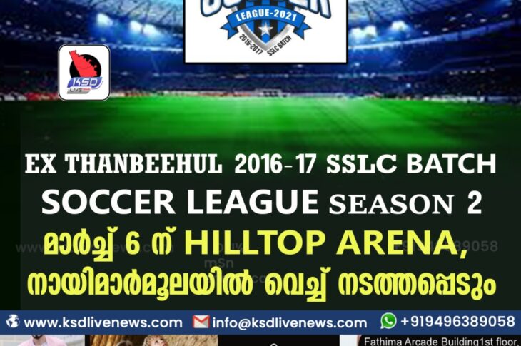 Uncategorized EX THANBEEHUL 2016-17 SSLC BATCH SOCCER LEAGUE SEASON 2 മാർച്ച് 3 ന് HILLTOP ARENA , നായിമാർമൂലയിൽ വെച്ച് നടത്തപ്പെടുംFebruary 19, 2021