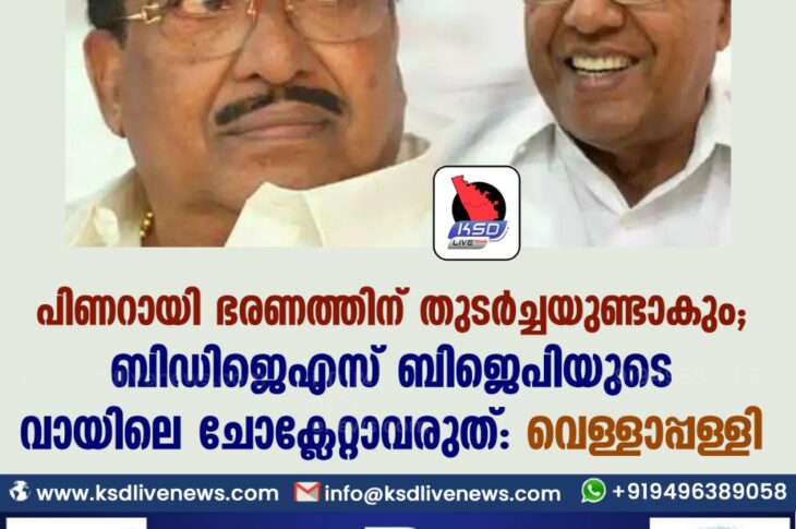 കേരളം പിണറായി ഭരണത്തിന് തുടർച്ചയുണ്ടാകും ; ബിഡിജെഎസ് ബിജെപിയുടെ വായിലെ ചോക്ലേറ്റാവരുത് : വെള്ളാപ്പള്ളിFebruary 19, 2021