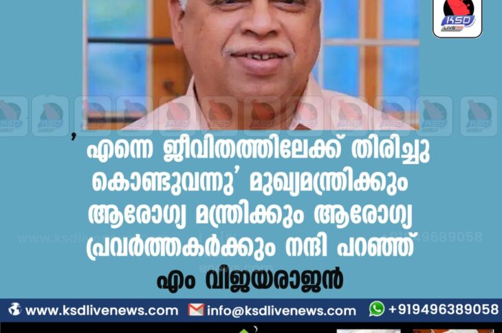 കേരളം ‘ എന്നെ ജീവിതത്തിലേക്ക് തിരിച്ചു കൊണ്ടുവന്നു’- മുഖ്യമന്ത്രിക്കും ആരോഗ്യ മന്ത്രിക്കും ആരോഗ്യ പ്രവർത്തകർക്കും നന്ദി പറഞ്ഞ് എം വിജയരാജൻFebruary 12, 2021