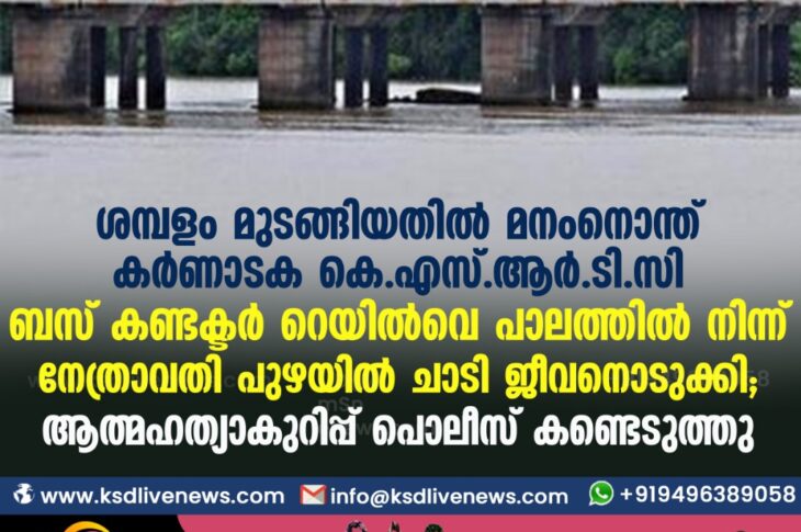 ശമ്പളം മുടങ്ങിയതില്‍ മനംനൊന്ത് കർണ്ണാടക കെ.എസ്.ആര്‍.ടി.സി ബസ് കണ്ടക്ടര്‍ റെയില്‍വെ പാലത്തില്‍ നിന്ന് നേത്രാവതി പുഴയില്‍ ചാടി ജീവനൊടുക്കി; ആത്മഹത്യാകുറിപ്പ് പൊലീസ് കണ്ടെടുത്തു