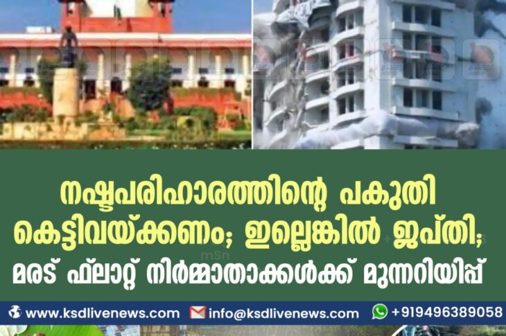 flash newsദേശീയം നഷ്ടപരിഹാരത്തിന്റെ പകുതി കെട്ടിവയ്ക്കണം ; ഇല്ലെങ്കിൽ ജപ്തി ; മരട് ഫ്ലാറ്റ് നിർമ്മാതാക്കൾക്ക് മുന്നറിയിപ്പ്February 9, 2021