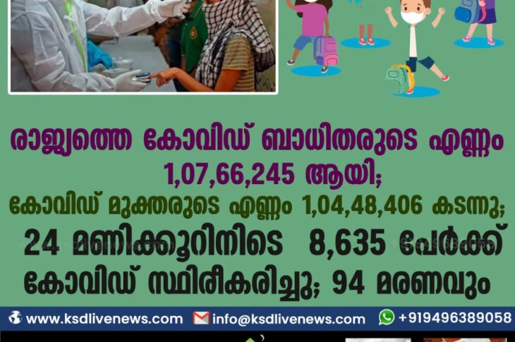 കോവിഡ് 19ദേശീയം രാജ്യത്തെ കോവിഡ് ബാധിതരുടെ എണ്ണം 1,07,66,245 കടന്നു ; കോവിഡ് മുക്തരുടെ എണ്ണം 1,04,48,406 ആയി;24 മണിക്കൂറിനിടെ 8635 പേർക്ക് കോവിഡ് സ്ഥിരീകരിച്ചു ; 94 മരണവുംFebruary 2, 2021