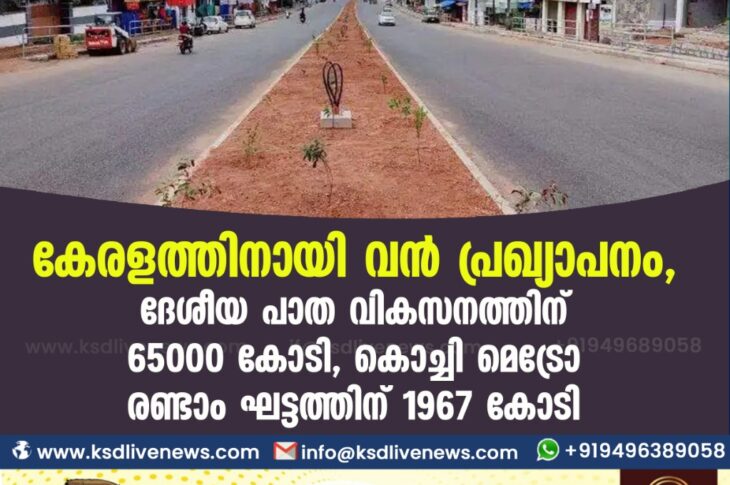 ദേശീയം കേരളത്തിനായി വൻ പ്രഖ്യാപനം , ദേശീയ പാത വികസനത്തിന് 65000 കോടി , കൊച്ചി മെട്രോ രണ്ടാം ഘട്ടത്തിന് 1967 കോടിFebruary 1, 2021