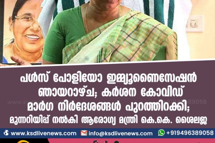 കേരളം പള്സ് പോളിയോ ഇമ്മ്യൂണൈസേഷന് ഞായറാഴ്ച; കര്ശന കോവിഡ് മാര്ഗ നിര്ദേശങ്ങള് പുറത്തിറക്കി; മുന്നറിയിപ്പ് നല്കി ആരോഗ്യ മന്ത്രി കെ.കെ. ശൈലജJanuary 29, 2021