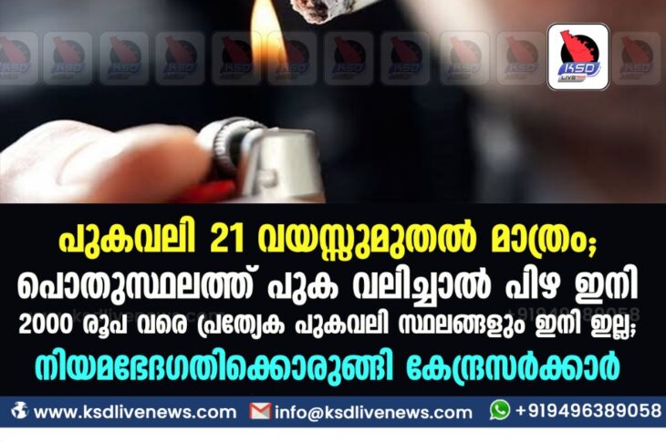 കേരളം പുകവലി 21 വയസ്സുമുതൽ മാത്രം ; പൊതുസ്ഥലത്ത് പുക വലിച്ചാൽ പിഴ ഇനി 2000 രൂപ വരെ പ്രത്യേക പുകവലി സ്ഥലങ്ങളും ഇനി ഇല്ല ; നിയമഭേദഗതിക്കൊരുങ്ങി കേന്ദ്രസർക്കാർJanuary 29, 2021