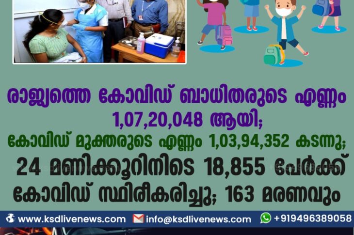 കോവിഡ് 19ദേശീയം രാജ്യത്തെ കോവിഡ് ബാധിതരുടെ എണ്ണം 1,07,20,048 ആയി ; കോവിഡ് മുക്തരുടെ എണ്ണം 1,03,94,352 കടന്നു ;24 മണിക്കൂറിനിടെ 18,855 പേർക്ക് കോവിഡ് സ്ഥിരീകരിച്ചു ; 163 മരണവുംJanuary 29, 2021