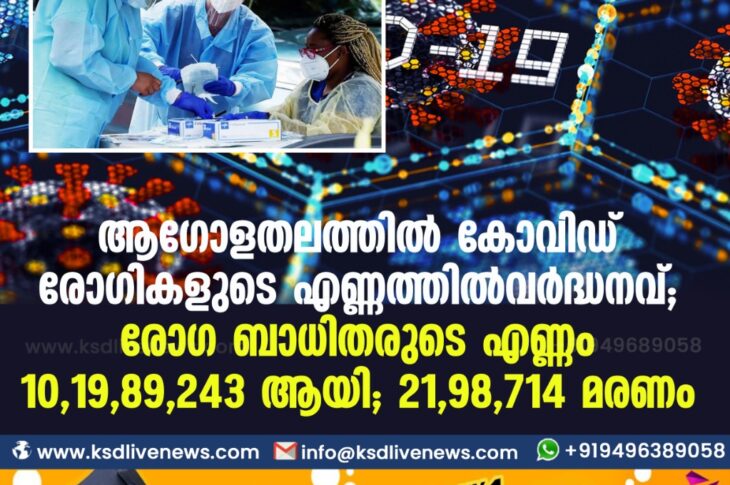കോവിഡ് 19വിദേശം ആഗോളതലത്തിൽ കോവിഡ് രോഗികളുടെ എണ്ണത്തിൽ വർദ്ധനവ് ; രോഗ ബാധിതരുടെ എണ്ണം 10,19,89,243 ആയി; 21,98,714 മരണംJanuary 29, 2021