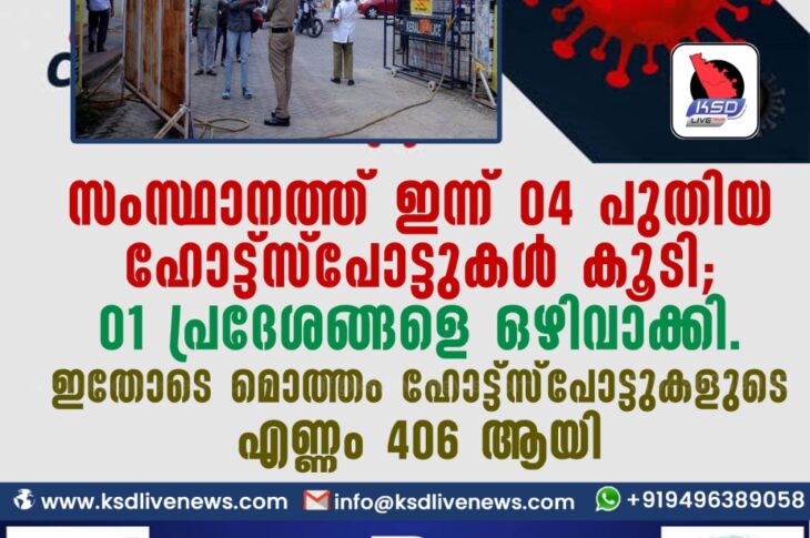 കേരളംകോവിഡ് 19 സംസ്ഥാനത്ത് ഇന്ന് 04 പുതിയ ഹോട്ട്സ്പോട്ടുകള് കൂടി; 01 പ്രദേശങ്ങളെ ഒഴിവാക്കി. ഇതോടെ മൊത്തം ഹോട്ട്സ്പോട്ടുകളുടെ എണ്ണം 406 ആയി.January 27, 2021