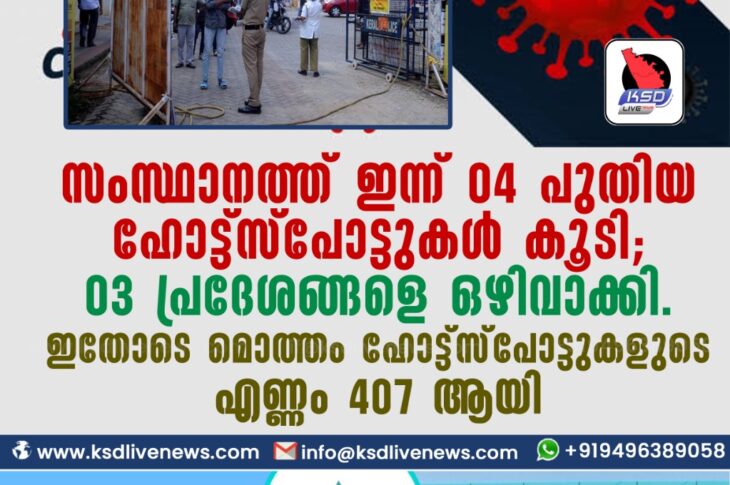 കേരളംകോവിഡ് 19 സംസ്ഥാനത്ത് ഇന്ന് 04 പുതിയ ഹോട്ട്സ്പോട്ടുകള് കൂടി; 03 പ്രദേശങ്ങളെ ഒഴിവാക്കി. ഇതോടെ മൊത്തം ഹോട്ട്സ്പോട്ടുകളുടെ എണ്ണം 407 ആയി.January 22, 2021