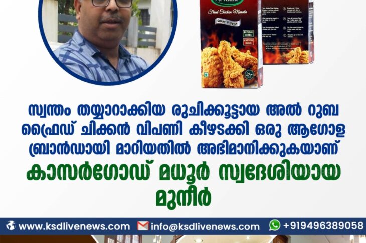 കാസർഗോഡ് സ്വന്തം തയ്യാറാക്കി യ രുചിക്കൂട്ടായ അൽ റുബ ഫ്രൈഡ് ചിക്കൻ വിപണി കീഴടക്കി ഒരു ആഗോള ബ്രാൻഡായി മാറിയതിൽ അഭിമാനിക്കുകയാണ് കാസർഗോഡ് മധൂർ സ്വദേശിയായ മുനീർDecember 24, 2020