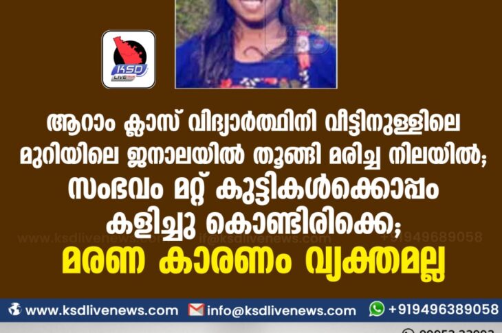 പ്രാദേശികം ആറാം ക്ലാസ് വിദ്യാർത്ഥിനി വീട്ടിനുള്ളിലെ മുറിയിലെ ജനാലയിൽ തൂങ്ങി മരിച്ച നിലയിൽ; സംഭവം മറ്റ് കുട്ടികൾക്കൊപ്പം കളിച്ചു കൊണ്ടിരിക്കെ; മരണ കാരണം വ്യക്തമല്ലDecember 17, 2020