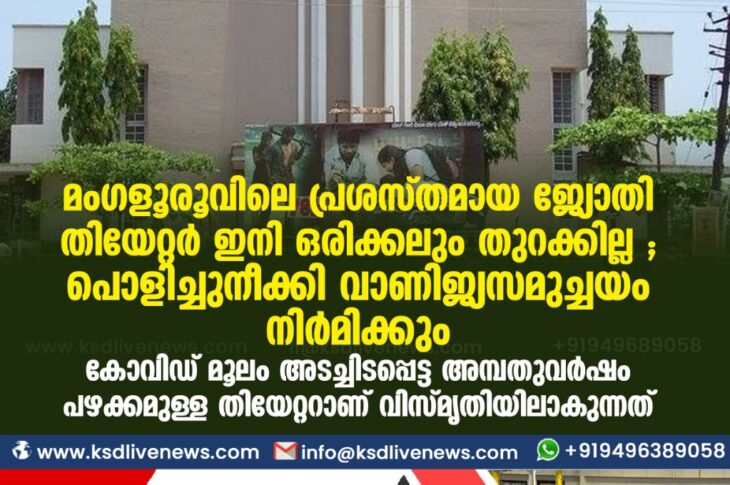പ്രാദേശികം മംഗളൂരൂവിലെ പ്രശസ്തമായ ജ്യോതി തിയേറ്റര് ഇനി ഒരിക്കലും തുറക്കില്ല ; പൊളിച്ചുനീക്കി വാണിജ്യസമുച്ചയം നിര്മിക്കുംDecember 7, 2020