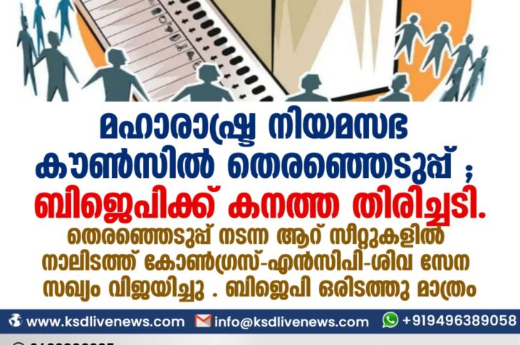 ദേശീയം മഹാരാഷ്ട്ര നിയമസഭ കൗണ്സില് തെരഞ്ഞെടുപ്പ് ; ബിജെപിക്ക് കനത്ത തിരിച്ചടി; തെരഞ്ഞെടുപ്പ് നടന്ന ആറ് സീറ്റുകളിൽ നാലിടത്ത് കോൺഗ്രസ് – എൻസിപി – ശിവ സേന സഖ്യം വിജയിച്ചു . ബിജെപി ഒരിടത്തു മാത്രംDecember 4, 2020