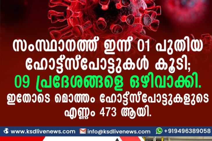 കോവിഡ് 19 സംസ്ഥാനത്ത് ഇന്ന് 01 പുതിയ ഹോട്ട്സ്പോട്ടുകള് കൂടി; 09 പ്രദേശങ്ങളെ ഒഴിവാക്കി. ഇതോടെ മൊത്തം ഹോട്ട്സ്പോട്ടുകളുടെ എണ്ണം 473 ആയി.December 3, 2020