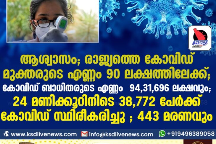 കോവിഡ് 19ദേശീയം ആശ്വാസം ; രാജ്യത്തെ കോവിഡ് മുക്തരുടെ എണ്ണം 90 ലക്ഷത്തിലേക്ക് ;കോവിഡ് ബാധിതരുടെ എണ്ണം 94,31,696 ലക്ഷവും ;24 മണിക്കൂറിനിടെ 38,772 പേർക്ക് കോവിഡ് സ്ഥിരീകരിച്ചു ; 443 മരണവുംNovember 30, 2020