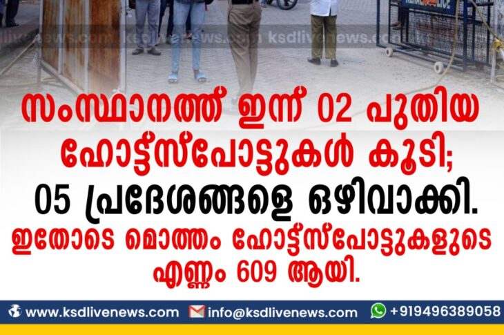 കേരളംകോവിഡ് 19 സംസ്ഥാനത്ത് ഇന്ന് 02 പുതിയ ഹോട്ട്സ്പോട്ടുകള് കൂടി; 05 പ്രദേശങ്ങളെ ഒഴിവാക്കി. ഇതോടെ മൊത്തം ഹോട്ട്സ്പോട്ടുകളുടെ എണ്ണം 609 ആയി.November 14, 2020