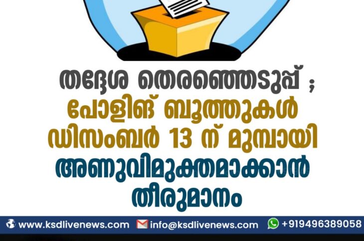 കാസർഗോഡ് തദ്ദേശ തെരഞ്ഞെടുപ്പ് ;പോളിങ് ബൂത്തുകൾ ഡിസംബർ 13 ന് മുമ്പായി അണുവിമുക്തമാക്കാൻ തീരുമാനംNovember 29, 2020