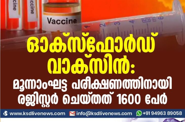 കോവിഡ് 19ദേശീയം ഓക്സ്ഫോർഡ് വാക്സിൻ : മൂന്നാംഘട്ട പരീക്ഷണത്തിനായി രജിസ്റ്റർ ചെയ്തത് 1600 പേർNovember 13, 2020