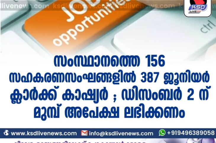 കേരളം സംസ്ഥാനത്തെ 156 സഹകരണസംഘങ്ങളിൽ 387 ജൂനിയർ ക്ലാർക്ക് കാഷ്യർ ; ഡിസംബർ 2 ന് മുമ്ബ് അപേക്ഷ ലഭിക്കണംNovember 12, 2020