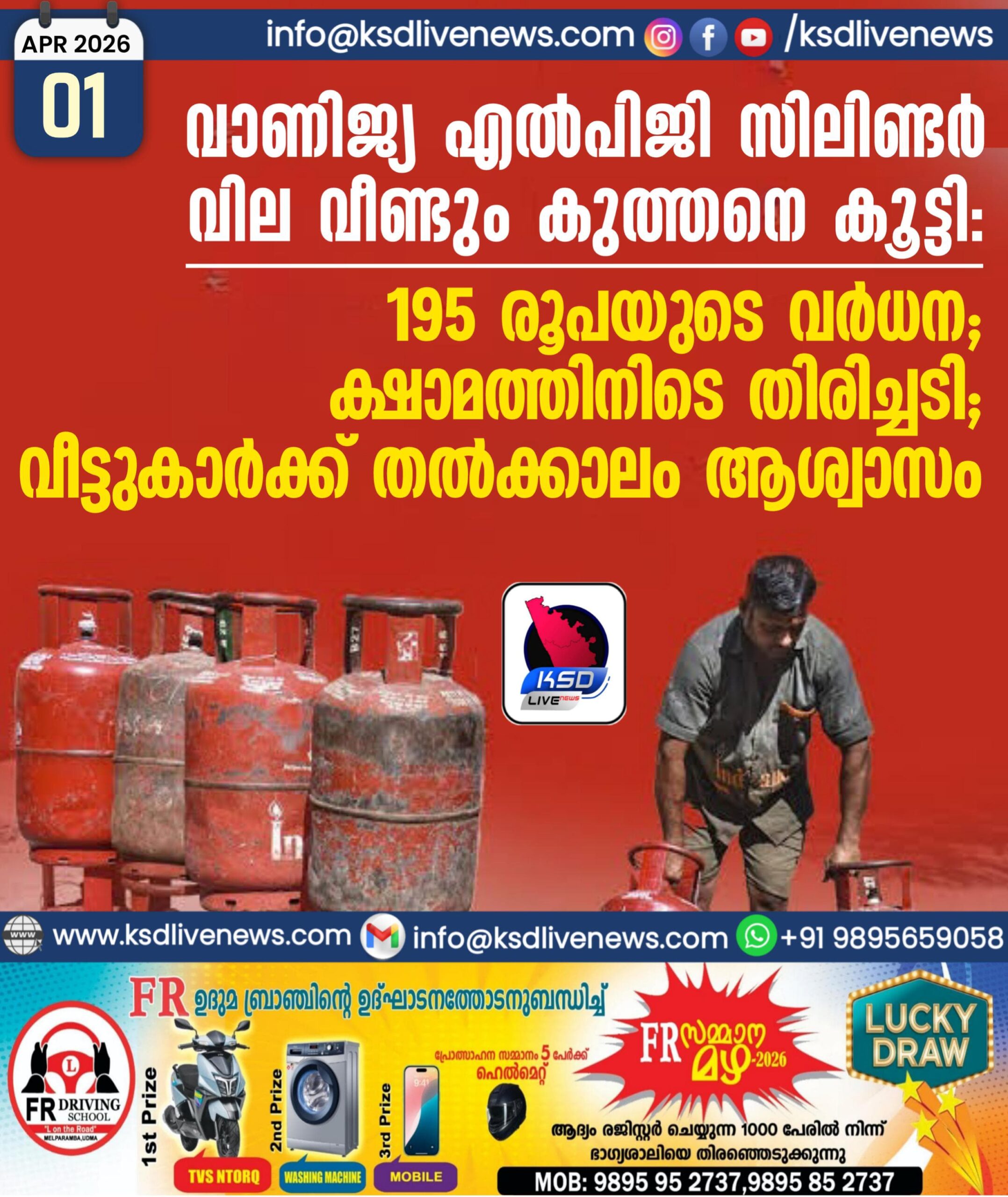 വാണിജ്യ എൽപിജി സിലിണ്ടർ വില വീണ്ടും കുത്തനെ കൂട്ടി; 195 രൂപയുടെ വർധന, ക്ഷാമത്തിനിടെ തിരിച്ചടി, വീട്ടുകാർക്ക് തൽക്കാലം ആശ്വാസം