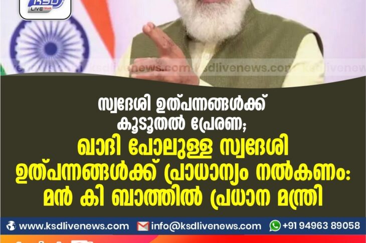 ദേശീയം സ്വദേശികൾക്ക് ഉത്പന്നങ്ങൾക്ക് കൂടൂതൽ പ്രേരണ ;ഖാദി പോലുള്ള സ്വദേശി ഉത്പന്നങ്ങൾക്ക് പ്രാധാന്യം നൽകണം : മൻ കി ബാത്തിൽ പ്രധാന മന്ത്രിOctober 25, 2020