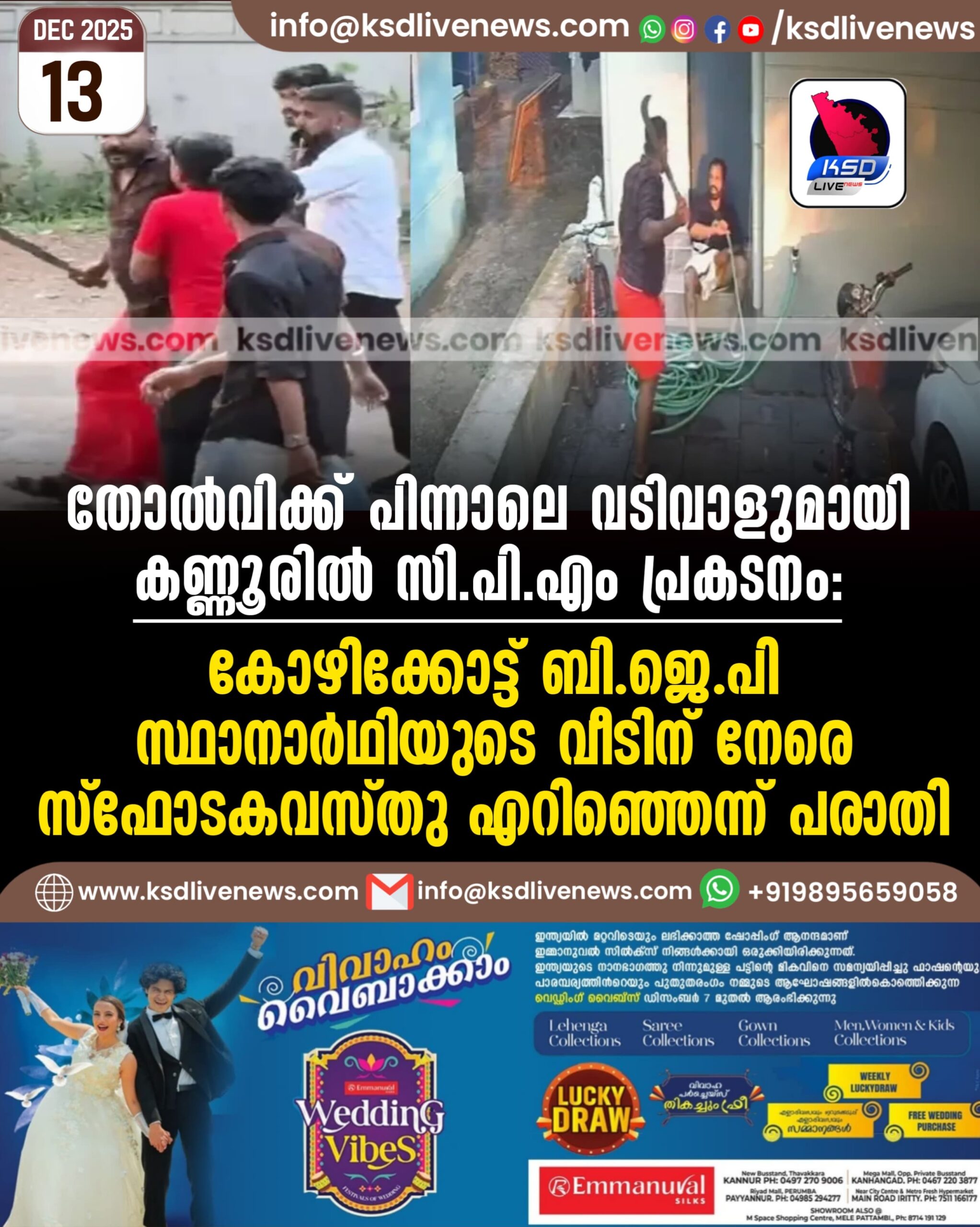 തോൽവിക്ക് പിന്നാലെ വടിവാളുമായി കണ്ണൂരിൽ സി.പി.എം പ്രകടനം: കോഴിക്കോട്ട് ബി.ജെ.പി സ്ഥാനാർഥിയുടെ വീടിന് നേരെ സ്ഫോടകവസ്തു എറിഞ്ഞെന്ന് പരാതി