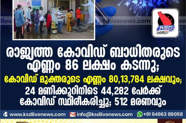 കോവിഡ് 19ദേശീയം രാജ്യത്ത കോവിഡ് ബാധിതരുടെ എണ്ണം 86 ലക്ഷം കടന്നു ; കോവിഡ് മുക്തരുടെ എണ്ണം 80,13,784 ലക്ഷവും ;24 മണിക്കൂറിനിടെ 44,282 പേർക്ക് കോവിഡ് സ്ഥിരീകരിച്ചു ; 512 മരണവുംNovember 11, 2020