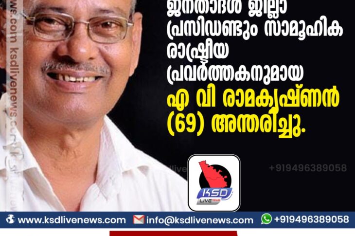 കാസർഗോഡ് ലോക താന്ത്രിക് ജനതാദള് ജില്ലാ പ്രസിഡണ്ടും സാമൂഹിക രാഷ്ട്രീയ പ്രവർത്തകനുമായ എ വി രാമകൃഷ്ണന് (69) അന്തരിച്ചു.October 24, 2020