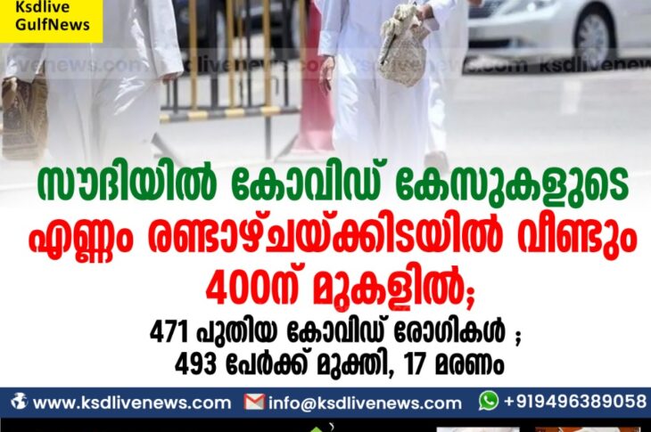 കോവിഡ് 19ഗൾഫ് സൗദിയിൽ കോവിഡ് കേസുകളുടെ എണ്ണം രണ്ടാഴ്ചയ്ക്കിടയിൽ വീണ്ടും 400ന് മുകളിൽ ;471 പുതിയ കോവിഡ് രോഗികൾ ; 493 പേർക്ക് മുക്തി, 17 മരണംNovember 10, 2020