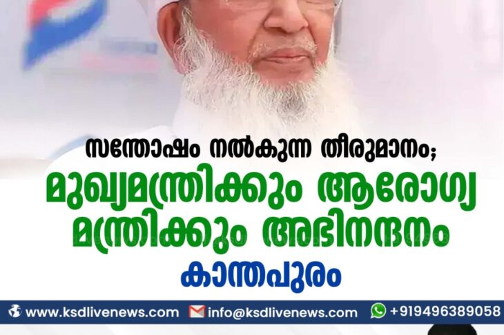 കേരളം സന്തോഷം നൽകുന്ന തീരുമാനം ; മുഖ്യമന്ത്രിക്കും ആരോഗ്യ മന്ത്രിക്കും അഭിനന്ദനം -കാന്തപുരംNovember 25, 2020