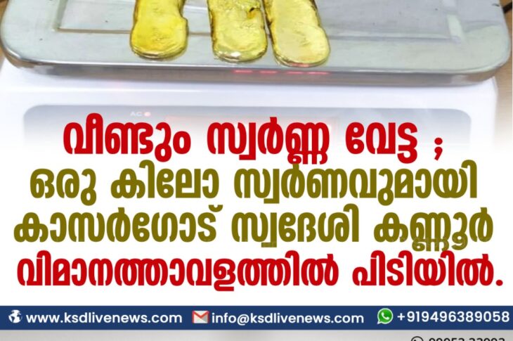 കേരളം വീണ്ടും സ്വർണ്ണ വേട്ട ; ഒരു കിലോ സ്വര്ണവുമായി കാസർഗോഡ് സ്വദേശി കണ്ണൂര് വിമാനത്താവളത്തില് പിടിയില്.November 22, 2020