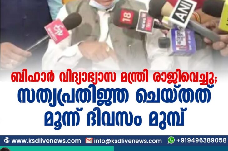 ദേശീയം ബിഹാർ വിദ്യാഭ്യാസ മന്ത്രി രാജിവെച്ചു; സത്യപ്രതിജ്ഞ ചെയ്തത് മൂന്ന് ദിവസം മുമ്പ്November 19, 2020