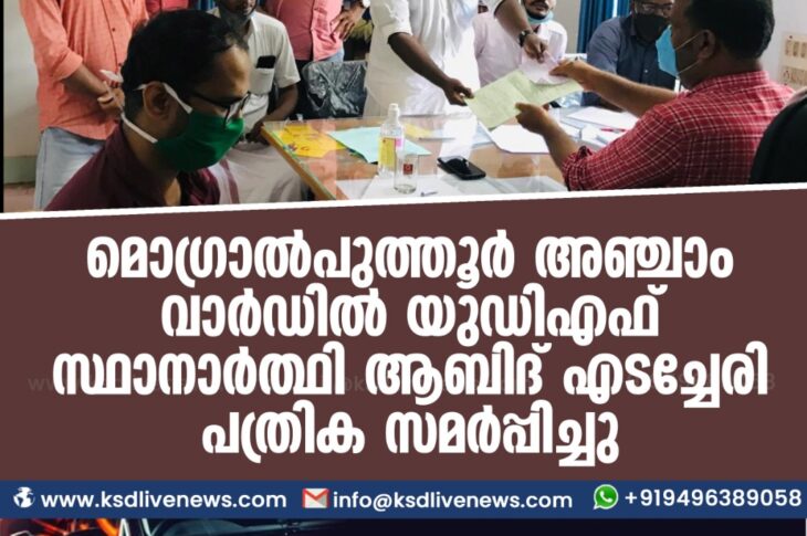 പ്രാദേശികം മൊഗ്രാൽപുത്തൂർ അഞ്ചാം വാർഡിൽ യുഡിഎഫ് സ്ഥാനാർത്ഥി ആബിദ് എടച്ചേരി പത്രിക സമർപ്പിച്ചു.November 19, 2020