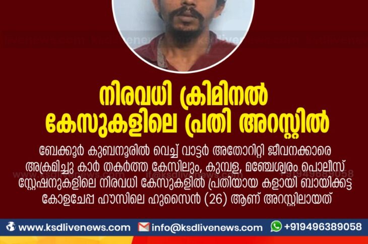 കാസർഗോഡ് നിരവധി ക്രിമിനൽ കേസുകളിലെ പ്രതി അറസ്റ്റിൽബേക്കൂര് കുബനൂരില് വെച്ച് വാട്ടര് അതോറിറ്റി ജീവനക്കാരെ അക്രമിച്ചു കാര് തകര്ത്ത കേസിലും, കുമ്പള, മഞ്ചേശ്വരം പൊലീസ് സ്റ്റേഷനുകളിലെ നിരവധി കേസുകളില് പ്രതിയായ കളായി ബായിക്കട്ട കോളചേപ്പ ഹൗസിലെ ഹുസൈൻ (26) ആണ് അറസ്റ്റിലായത്November 2, 2020