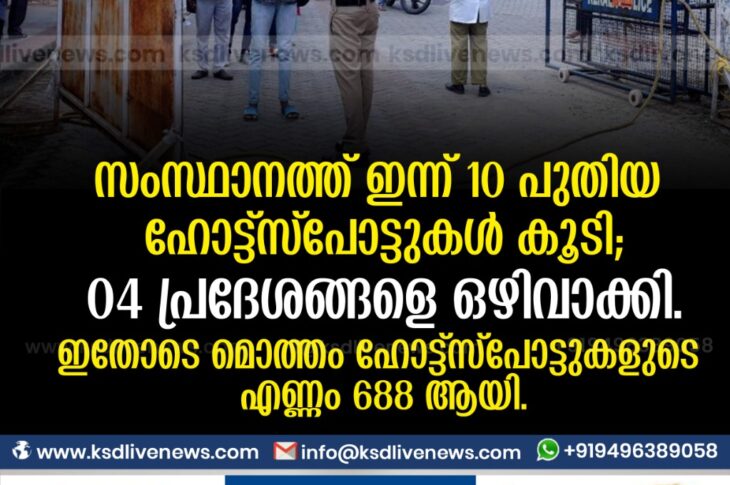 കേരളംകോവിഡ് 19 സംസ്ഥാനത്ത് ഇന്ന് 10 പുതിയ ഹോട്ട്സ്പോട്ടുകള് കൂടി; 04 പ്രദേശങ്ങളെ ഒഴിവാക്കി.ഇതോടെ മൊത്തം ഹോട്ട്സ്പോട്ടുകളുടെ എണ്ണം 688 ആയി.October 27, 2020