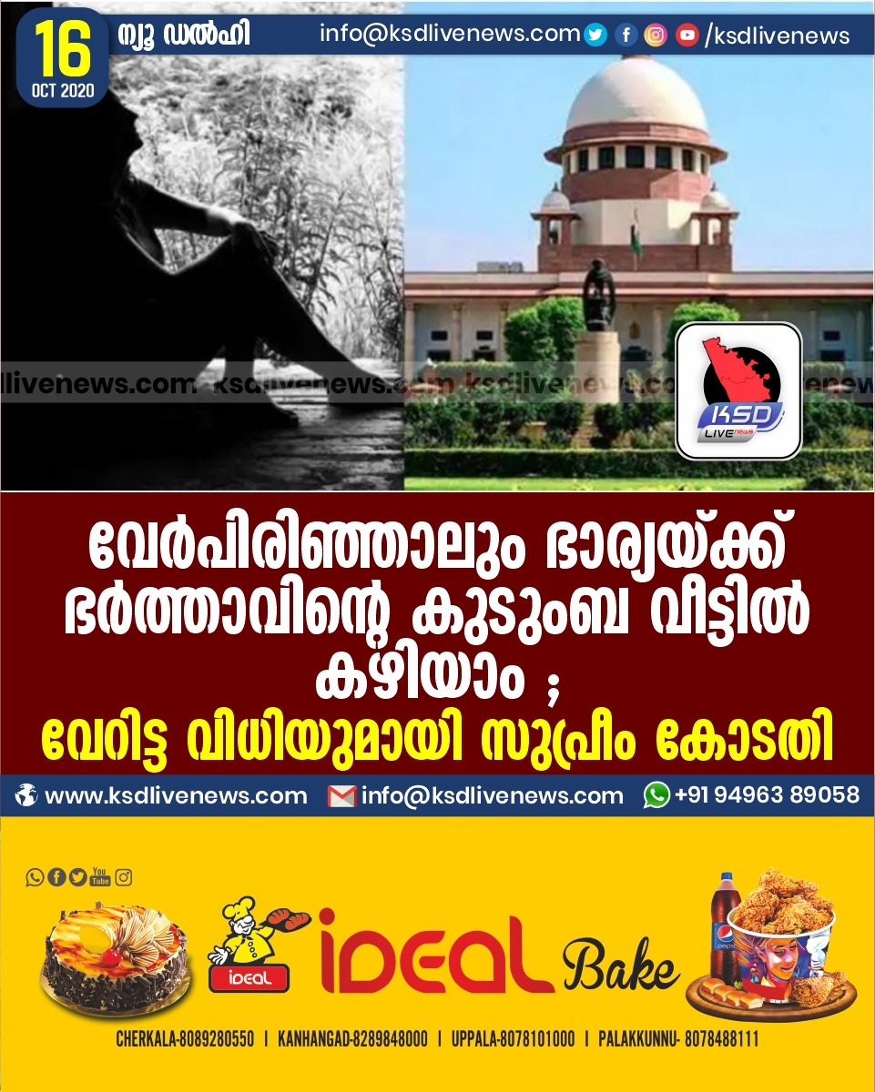 ദേശീയം വേർപിരിഞ്ഞാലും ഭാര്യയ്ക്ക് ഭർത്താവിന്റെ കുടുംബ വീട്ടിൽ കഴിയാം ; വേറിട്ട വിധിയുമായി സുപ്രീം കോടതിOctober 16, 2020