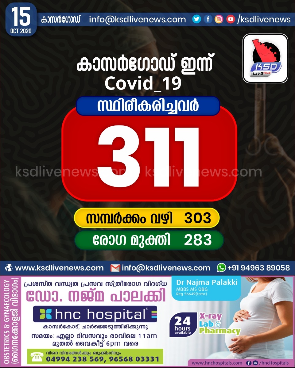 പ്രാദേശികം കാസർഗോഡ് ജില്ലയിൽ ഇന്ന് 311 പേർക്ക് കോവിഡ് സ്ഥിരീകരിച്ചു. സമ്പർക്കം വഴി 303 പേർക്കും. 283 പേർക്ക് രോഗ മുക്തിOctober 15, 2020